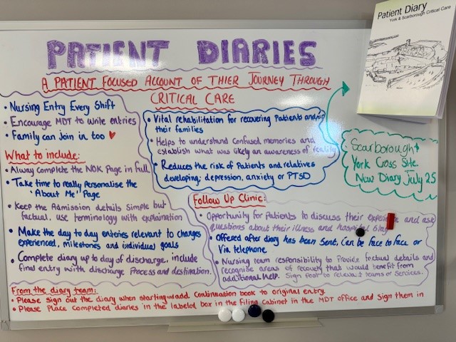 Thanks to generous donations the Critical Care teams at Scarborough and York hospitals have created a new patient diary which is personalised to each patient. The diary allows staff to note down information such as a patient’s hobbies, for example a staff nurse wrote a patients favourite football team scores in their diary. Staff are encouraged to find out the patients favourite music so it can be played and ask their loved ones information about how they like their appearance to be.